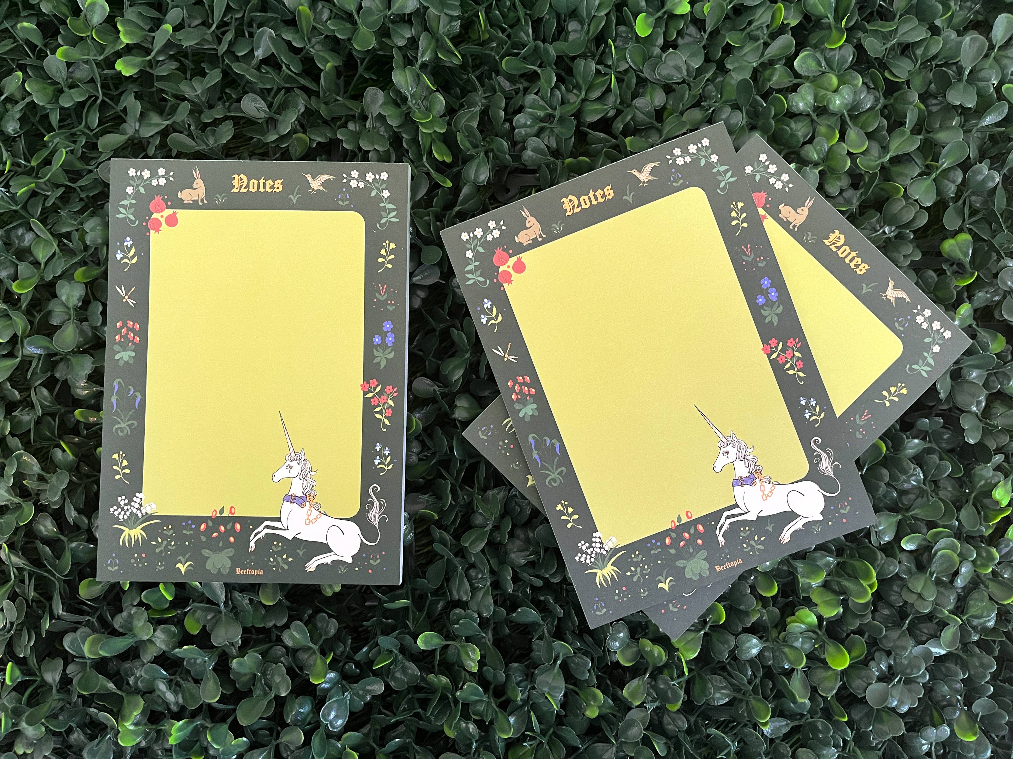 Inspired by the tradition of unicorn tapestries throughout art history, this memo pad features the iconic unicorn in captivity surrounded by a lush garden of medieval flowers. Your to-do list just got a castlecore flair! Notepad measures 4.13in x 5.83in, or standard A6 size. Writable area is 3in x 4.5in.